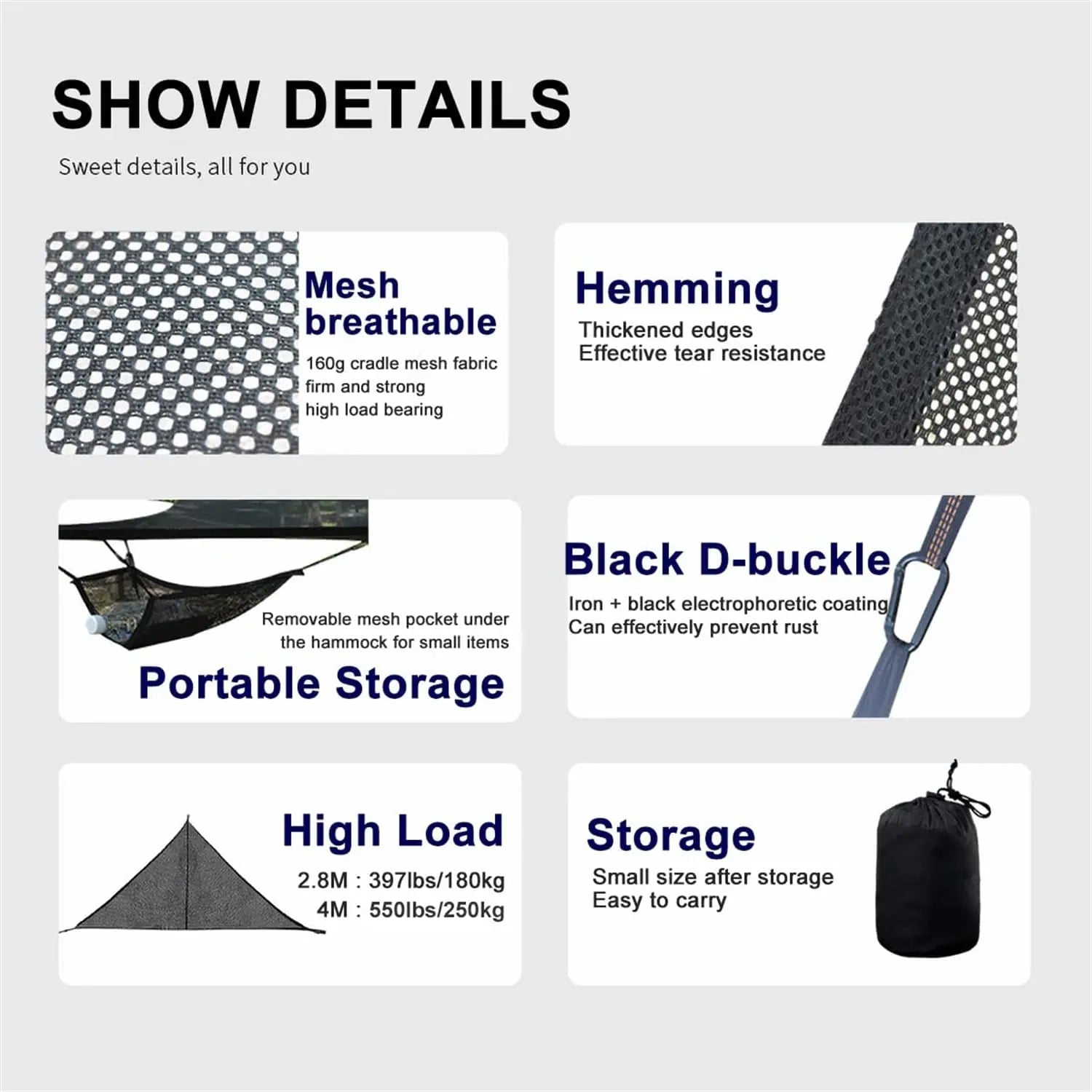 Big & Tall Approved. This hammock is made of heavy-duty 60g mesh that holds up to 440 lbs, so you can relax without worry. Choose 9.2 ft or 13.1 ft for your perfect stretch-out space. Packs down small (5.5" × 5.5" × 9.45" or 6.3" × 6.3" × 11") and weighs just 2.16 lbs or 2.82 lbs—easy to carry anywhere. Black or green, backyard or beach—your call.